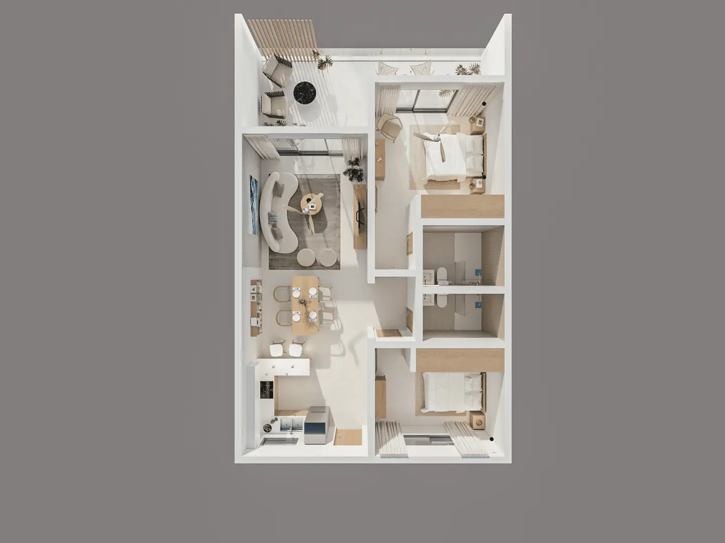 Obiekt składa się z 3 budynku po 25 apartamentów. Wszystkie mieszkania będą miały 2 sypialnie od 104m2 do 112m2. Penthouse na ostatnim piętrze będą miały prywatne wyjście na dach – solarium.