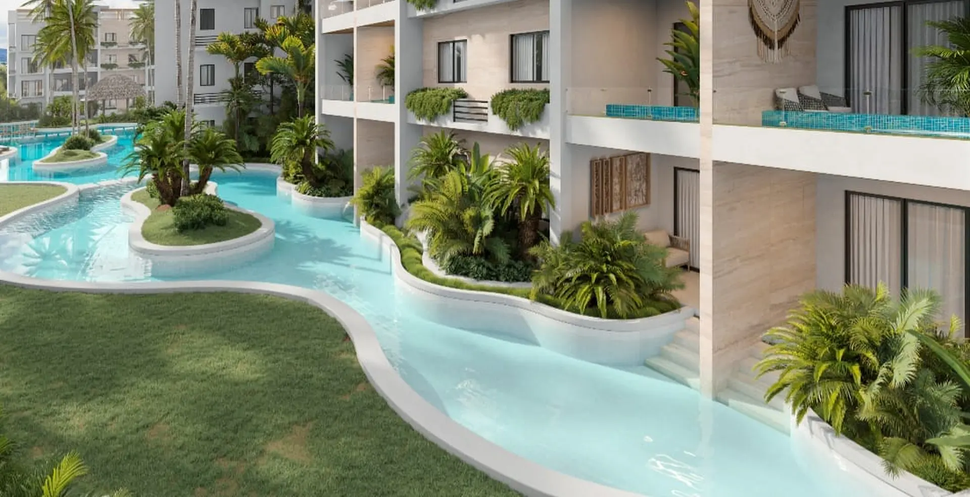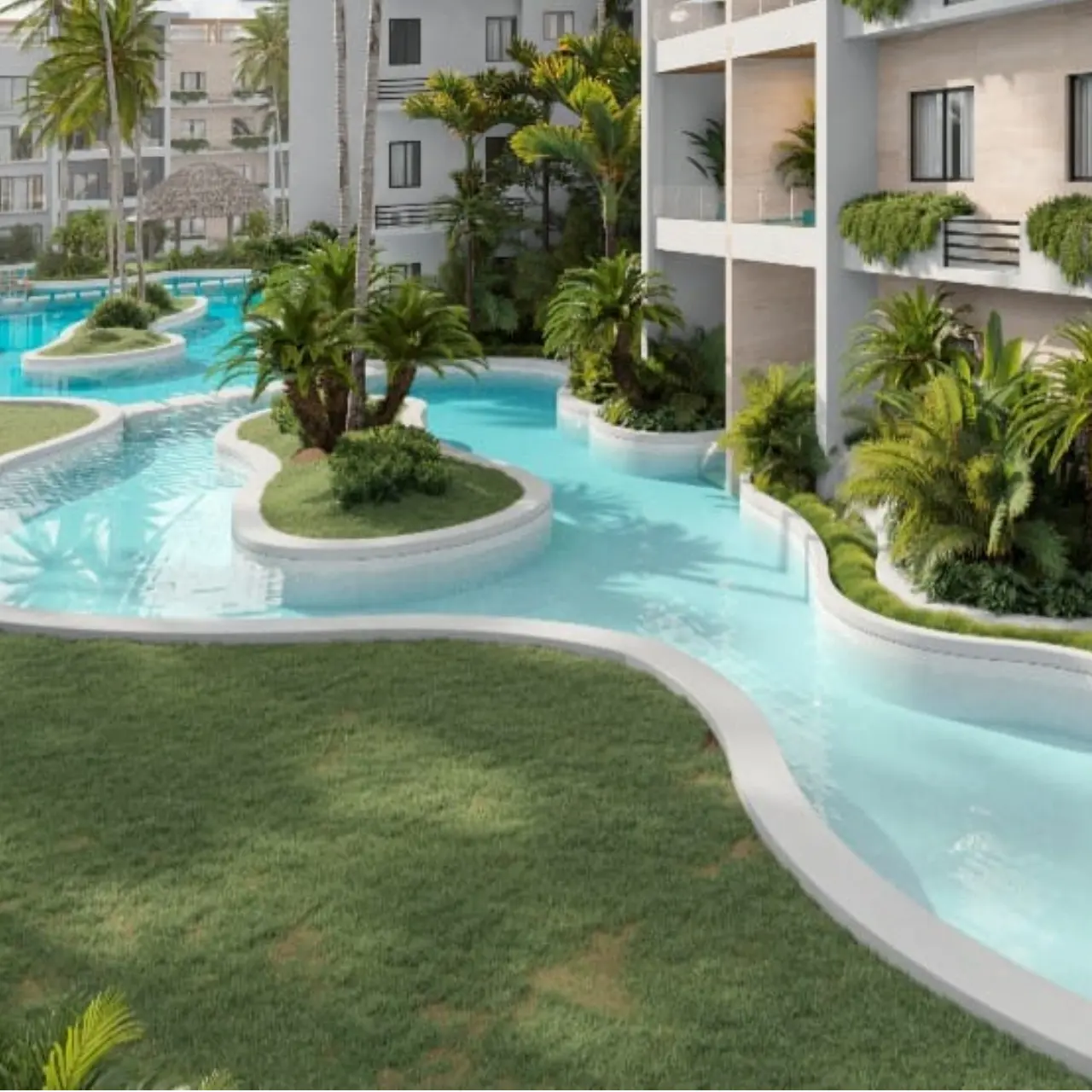Projekt zbudowany wokół imponującego, lagunowego basenu tworzy klimat butikowego resortu. Zadbana zieleń, prywatność i przytulna atmosfera sprawiają, że poczujesz się tu jak w pięciogwiazdkowym hotelu – z tą różnicą, że to Twój własny adres na Karaibach.